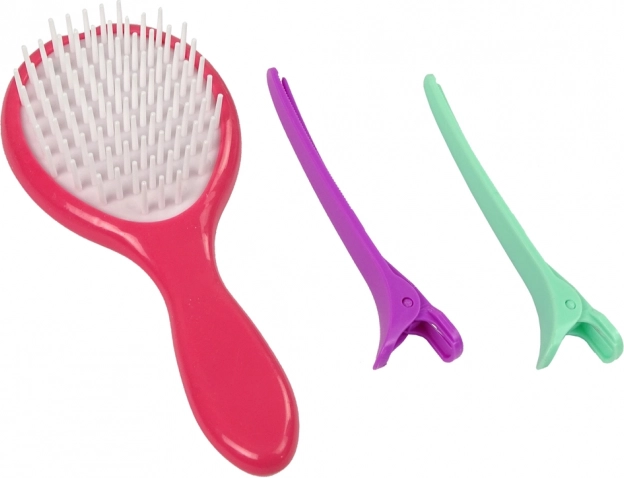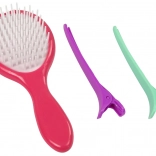 Zoznámte sa so súpravou, ktorá obsahuje kefu, žehličku, dve sponky a šesť farebných kried na vlasy.