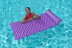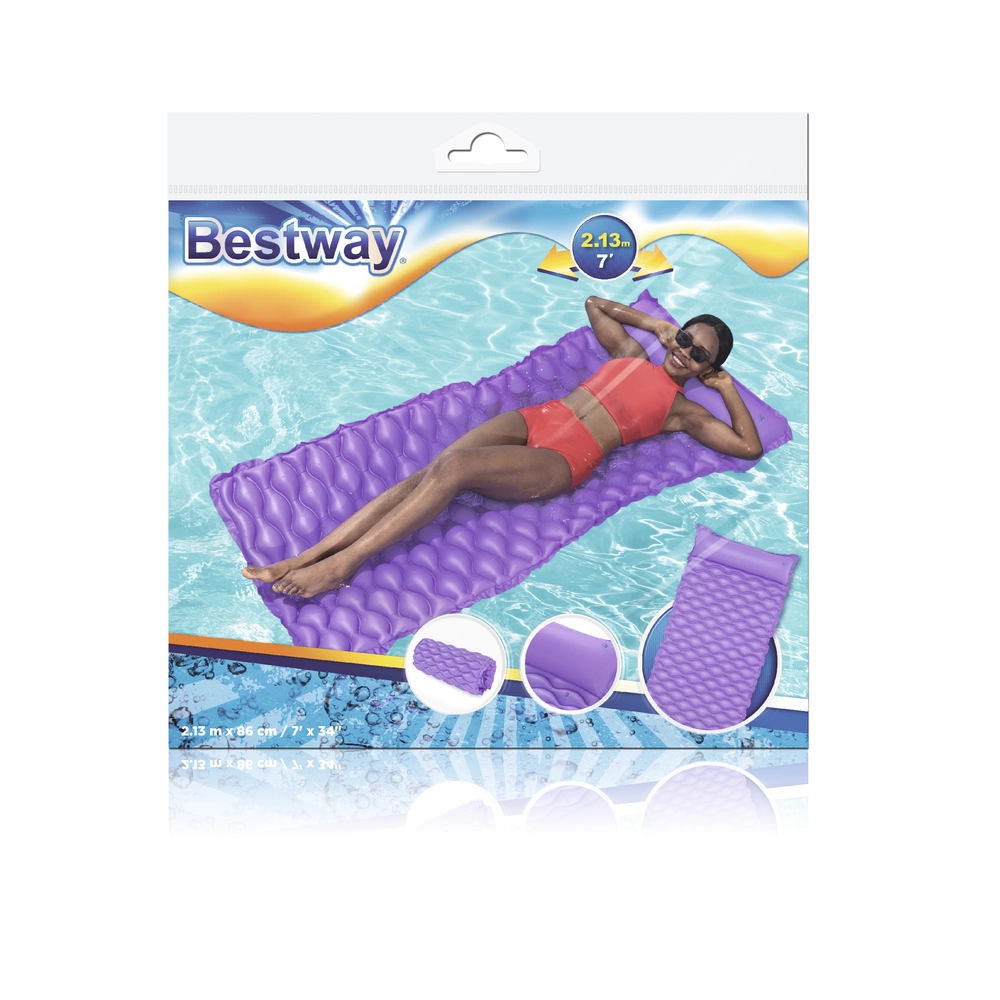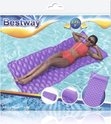 Plávajúce ležadlo Bestway vyniká komfortným tvarom so vstavaným vankúšom, ktorý podopiera hlavu a šiju. Vlnitý povrch zvyšuje pohodlie pri ležaní, zatiaľ čo pevné PVC zaisťuje dlhú životnosť a odolnosť voči drobnému poškodeniu.