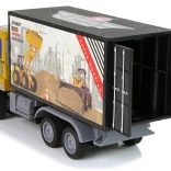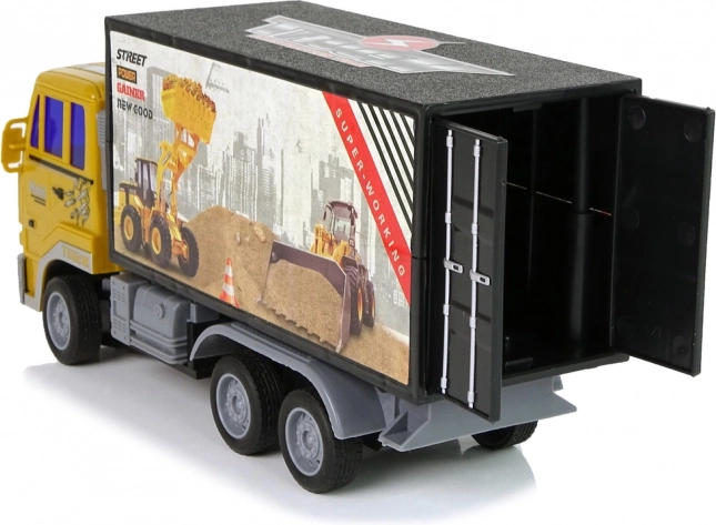 Kamión má žltú kabínu a čierny kontajner s výraznými nálepkami, verne napodobňujúci reálny stavebný stroj.