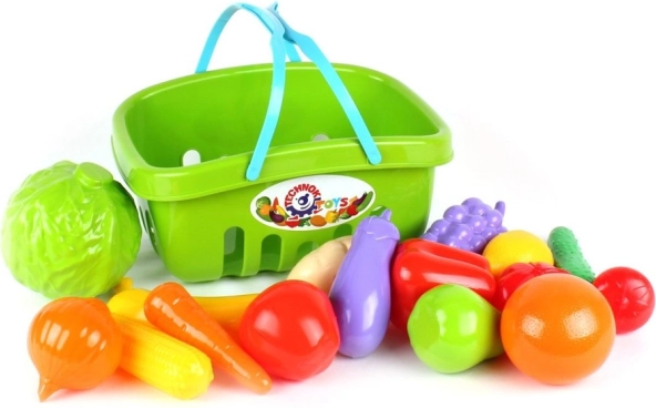 Obsah sady: nákupný košík, banán, hrozno, paradajka, hruška, uhorka, baklažán, mrkva, cibuľa, paprika, pomaranč, citrón, kapusta, kukurica.