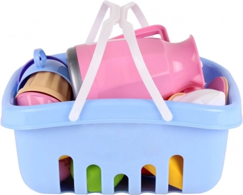 Džbán s viečkom, 4 šálky s podšálkami a lyžičkami, taniere, dezerty a ovocie – všetko v jednom košíku pre realistickú a kreatívnu hru.