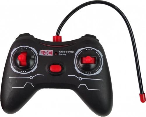 Diaľkové ovládanie R/C vozidla sa skladá z čiernych komponentov v kombinácii s červenými tlačidlami.