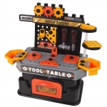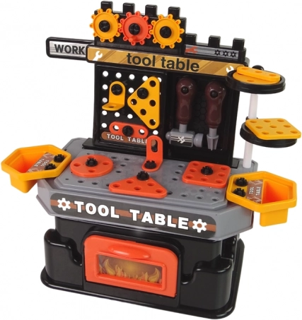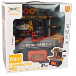 - Pracovný stolík s nástennou doskou, úložné boxy, zverák, pohyblivé ozubené kolesá, kladivko, skrutkovač, skrutky a matice, háčiky na náradie, otvárateľný priestor na odkladanie, prvky na prišróbovanie, pracovná doska s otvormi