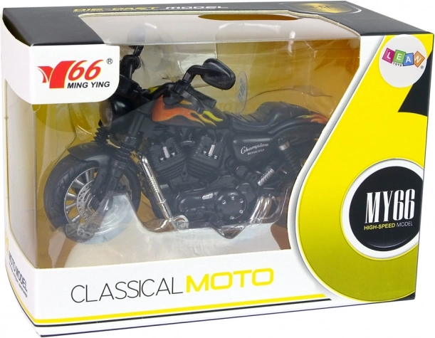 Čierne telo motorky s oranžovými plameňmi a detailnými prvkami ponúka autentický vzhľad skutočného motocykla.