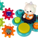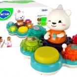 - Režim tvorby: Stredové žlté tlačidlo aktivuje melódie a sedem rôznych farieb diód. Deti môžu skladať vlastné melódie prostredníctvom pohybu ozubených kolies. Rotácia kolies počas melódií zvyšuje rytmus a rýchlosť hudby.