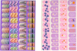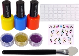 Ozdobte svoje nechty pomocou rôznych vzorovaných nálepiek a sypkých trblietok v troch žiarivých farbách.