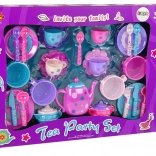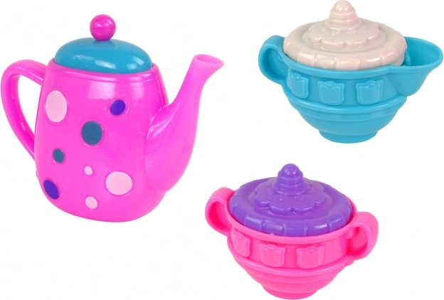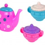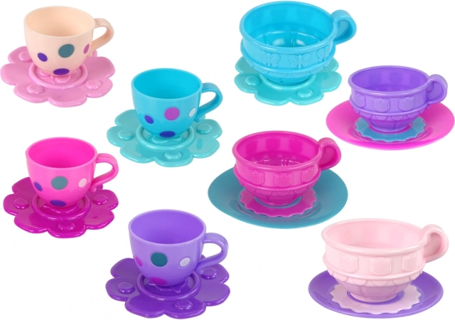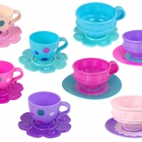 Set obsahuje: 4 farebné poháriky, 4 tanieriky, 4 lyžičky, 4 vidličky, 4 lyžice, 4 mištičky, kanvičku, cukorničku a čajník.