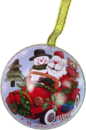 Táto kovová vianočná ozdoba spája dekoráciu a praktické využitie v jednom. Otváracia konštrukcia umožňuje schovať do nej malé prekvapenie – od cukríkov po drobné darčeky. Zelený povrch s ilustráciou Mikuláša a snehuliaka v červenom autíčku podčiarkne radostnú zimnú náladu.
