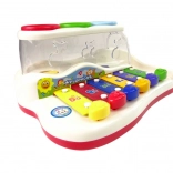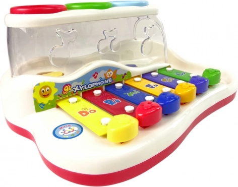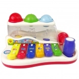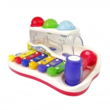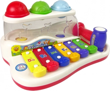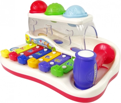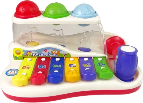 Tento farebný detský xylofón kombinuje hudobnú hračku a zábavnú guličkovú dráhu. Klávesy v pestrých farbách po ťuknutí vydávajú príjemné tóny a dieťa sa hravou formou učí rozlišovať zvuky, rytmus aj jednoduché melódie. Farebné balóniky možno vklepávať kladivkom a pozorovať ich cestu, ktorá končí z boku hračky – to motivuje k ďalšej hre a trénuje koordináciu oko–ruka.
