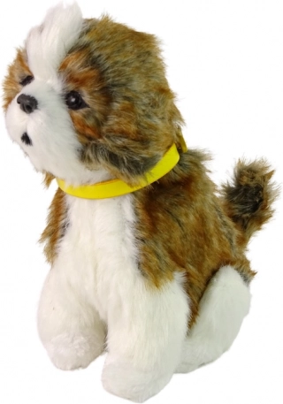 Plyšové prevedenie v bielo-hnedej farbe je mimoriadne príjemné na dotyk, zatiaľ čo žltý odnímateľný obojok pridáva psíkovi na kráse. Oči v tmavej farbe s hnedým okrajom dodávajú realistický vzhľad.