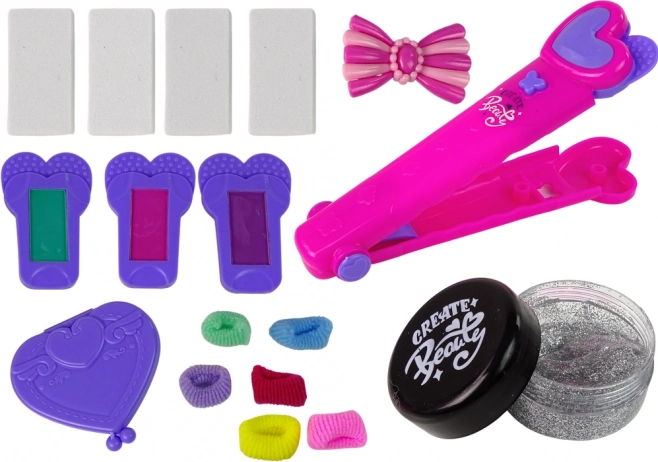 Okrem farebných pramienkov možno účes obohatiť ďalšími príslušenstvami v sade, ako sú farebné gumičky, sponka v tvare mašle, hrebienok, vymeniteľné hubky pre žehličku a gél s trblietkami. Všetko je usporiadané na základe pre komfortnú a pohodlnú hru.