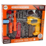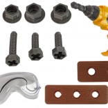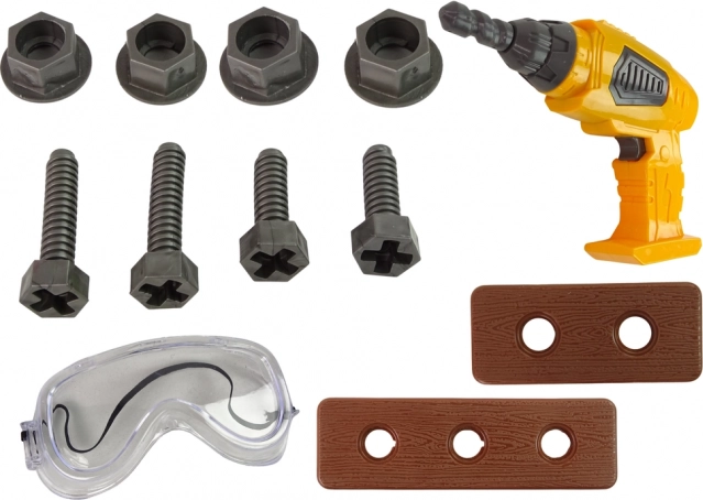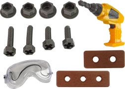 Táto sada je vybavená vŕtačkou na batérie, ktorá simuluje skutočné vŕtanie a vydáva realistické zvuky. Ďalej obsahuje kľúče, skrutkovač, kladivo a ďalšie nástroje pre kreatívnu hru. Všetky časti sú bezpečne uskladnené v farebnom balení, ktoré samo o sebe navodzuje dojem skutočných nástrojov.