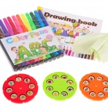 Tri disky po ôsmich obrázkoch (zvieratá, vozidlá, ovocie a zelenina) a sada 12 fixiek s blokom a hubkou umožnia deťom ihneď začať tvoriť bez ďalšieho dokupovania.