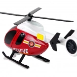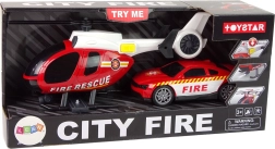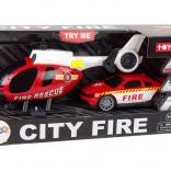 Táto záchranárska sada CITY FIRE prináša deťom všetko, čo potrebujú pre ich vlastné hasičské zásahy. Veľká helikoptéra s nápisom FIRE RESCUE má ručne otáčavé vrtule s rozpätím cca 20 cm a po stlačení bočného tlačidla spúšťa svetlá a zvuky štartu a letu. Športové hasičské auto s gumovými pneumatikami a výraznými potlačami jazdí hladko po rovnom povrchu a dopĺňa akčné scenáre.