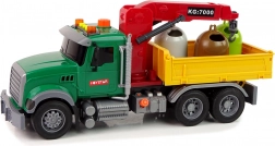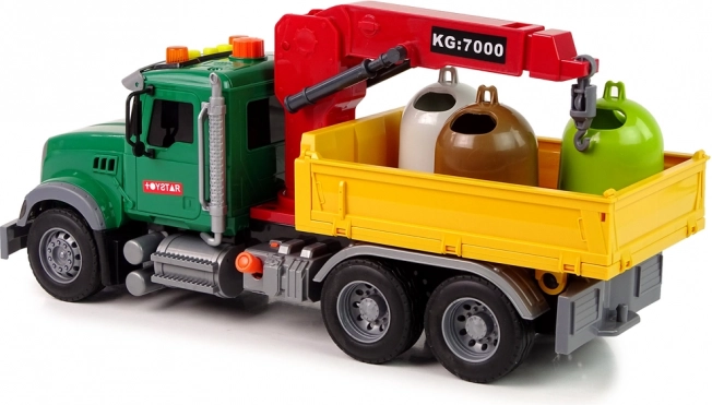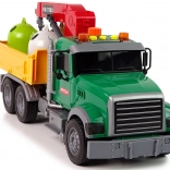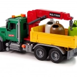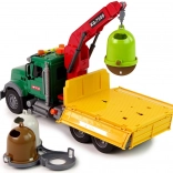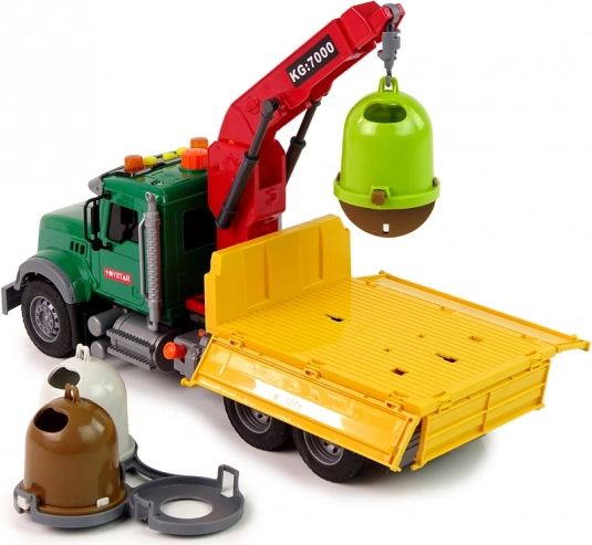 Tento detailne spracovaný smetiarsky kamión prevezie všetko potrebné – od priložených kontajnerov až po drobné hračky. Zadný náves je vybavený pohyblivým žeriavom, ktorý ľahko dvíha a pokladá kontajnery. Na streche kabíny nájdete ovládacie tlačidlo na aktiváciu ramien žeriava a efektov.