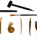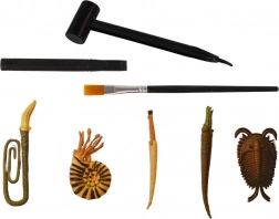 - 1 staroveké stvorenie (náhodný druh), dláto, štetček, kladivko, sadra, hubka v tvare dinosaura
