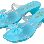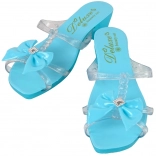 Krásne modré sandáliky, ktoré rozžiaria každú príležitosť, sú vyrobené z plastu s priehľadnými pásikmi a mašľou zdobenou kamienkami.