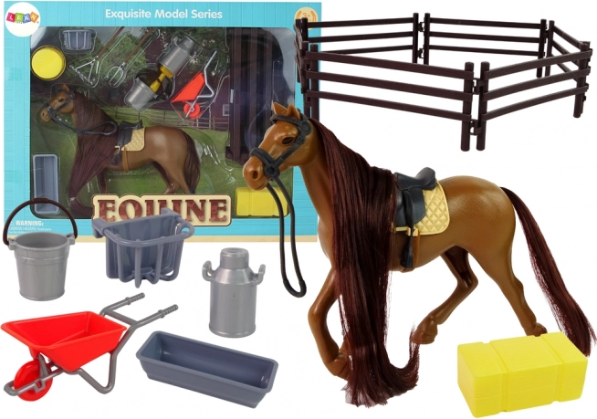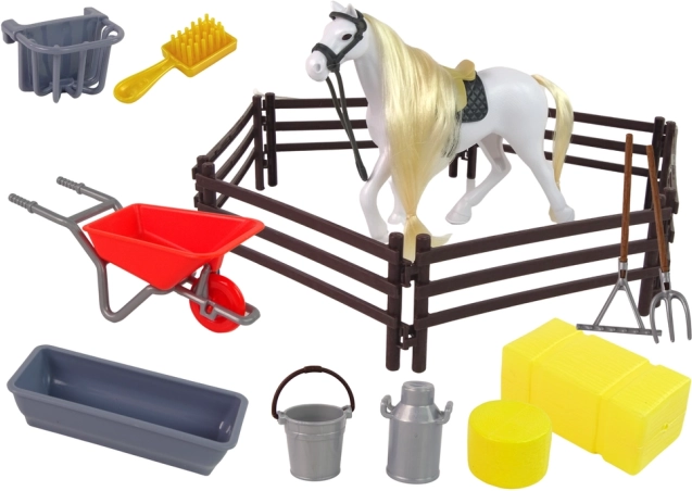 Táto čarovná figúrka koňa s dlhou hrivou je ideálna na česanie a tvorbu vrkočov. Sada obsahuje aj príslušenstvo, ktoré je potrebné pre každodenný život v stajni - ako koliesko, hrable, vidly alebo vedrá na vodu a jedlo. Deti sa môžu tešiť na hodiny zábavy, keď budú starať o svojho nového zvieracieho kamaráta a rozvíjať svoju predstavivosť a manuálne zručnosti.