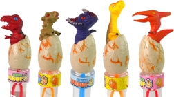 Každá fľaštička má podlhovastý tvar s viečkom v tvare dinosaura vo vajíčku. K dispozícii je 6 druhov (pterodaktyl, T‑Rex, triceratops, stegosaurus, brachiosaurus, ankylosaurus) v rôznych farbách. Obsah je bezfarebný a certifikovaný podľa CE/EN 71 na bezpečné používanie.