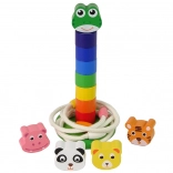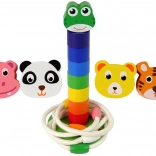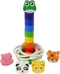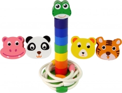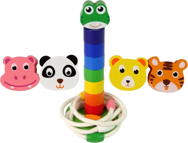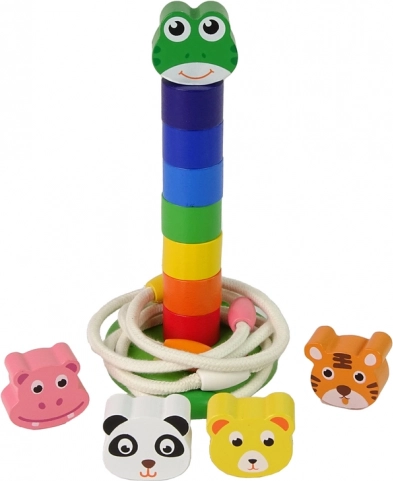 Táto drevená vzdelávacia hračka spája dve obľúbené aktivity v jednom: skladanie farebnej veže s hlavou roztomilej žabky či iného zvieratka a hádzanie lanových krúžkov na kolík. Dieliky v sýtych farbách prirodzene motivujú deti k triedeniu, rátaniu a objavovaniu, zatiaľ čo robustná drevená konštrukcia zaručí dlhú životnosť.