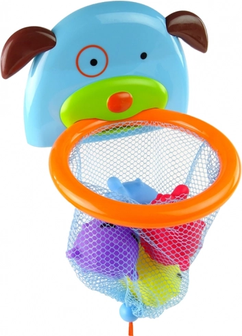 Táto kúpace hračka premení chvíle vo vani na zábavu. Dieťa hádže loptičky alebo gumové rybičky do basketbalového koša s podobizňou psíka, čím rozvíja svoju koncentráciu a motorické zručnosti. Hračka má prísavky, ktoré ľahko priľnú k hladkým povrchom, takže ju možno pripevniť na kachličky alebo sklo.