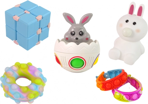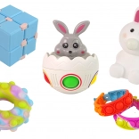 Pop it donut, náramky, zajačik a vajíčko, stláčacie figúrky aj fidget kocka – perfektné pre zmyslovú hru a uvoľnenie stresu.