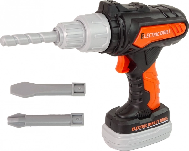 V sade nájdete dve vymeniteľné špičky, ktoré umožňujú jednoduché prispôsobenie rôznym typom skrutiek, a ochranné okuliare pre bezpečné hranie. Oranžová farba vŕtačky pridáva autentický vzhľad.