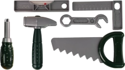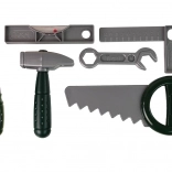 Set obsahuje všetky potrebné nástroje pre malých opravárov, vrátane kladiva, skrutkovača a pílky.