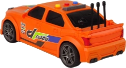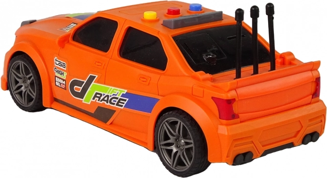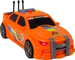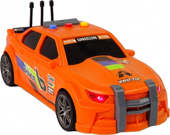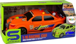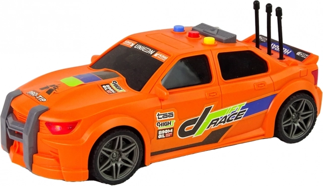 Oranžové pretekárske auto s výraznými potlačami, športovými prvkami a starostlivo spracovanými detailmi zaujme na prvý pohľad. Odolný plast znesie časté hranie.