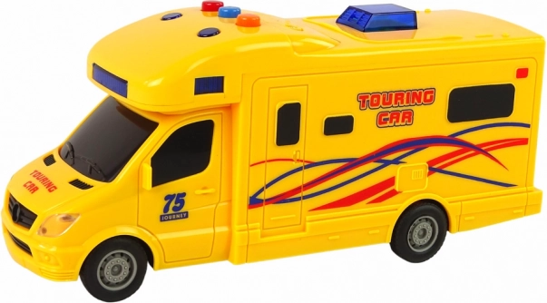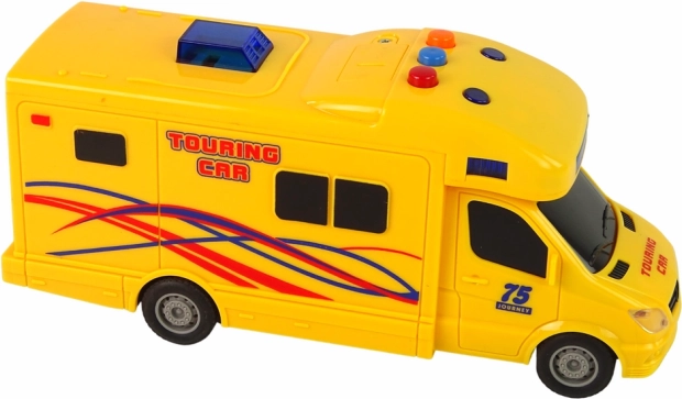 Žltý karavan pre deti prináša porciu prázdninovej zábavy na každý deň. Vďaka frikčnému pohonu stačí pritlačiť, natiahnuť dozadu a pustiť – a voz vyrazí vpred. O realistickejší zážitok sa postarajú svetelné efekty s modrými LED a zvukové efekty štartu, jazdy aj cúvania. Robustné spracovanie, gumové pneumatiky a kompaktné rozmery z neho robia ideálnu hračku na doma aj na cesty.