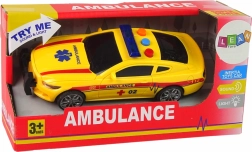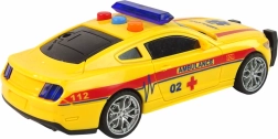Rýchla a odolná žltá ambulancia s výraznými potlačami „Ambulance“ prenesie deti priamo do centra záchrannej akcie. Po stlačení tlačidiel sa rozsvietia modré diódy nad kabínou a zaznejú realistické zvuky – štart motora, klaksón a výstražná siréna. Vďaka zotrvačníkovému pohonu stačí zatlačiť, natiahnuť smerom dozadu a auto samo vyrazí vpred.