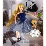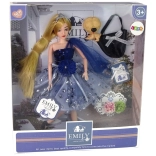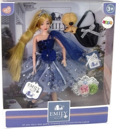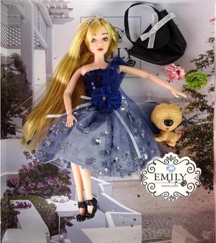 Roztomilá bábika Emily v trblietavých modrých šatách s tylovým prekrytím poteší všetky malé milovníčky módy. V sade nájdete aj psíka, elegantnú kabelku so striebornou mašľou a dve kvety na kreatívne zdobenie. Bábika má pohyblivé končatiny pre jednoduché pózovanie a je ideálna na fantazijnú hru a módne prehliadky.