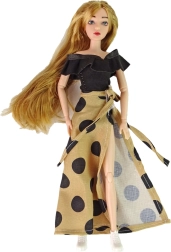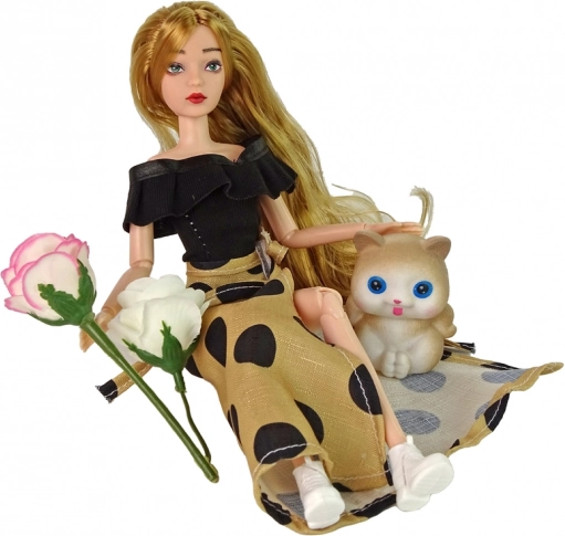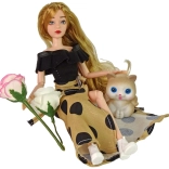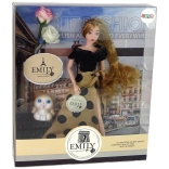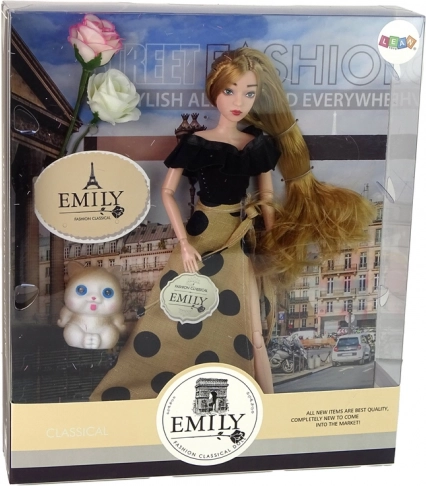 Bábika Emily je oblečená do elegantnej čiernej blúzky a dlhej béžovej sukne s bodkami. Má dlhé vlasy ideálne na česanie a tvorbu účesov, realisticky maľovanú tvár s modrými očami a je plne polohovateľná vďaka kĺbom. V balení nájdete aj roztomilé mačiatko a dekoratívne ruže, ktoré obohatia každodenné príbehy a hranie na rodinu.