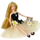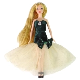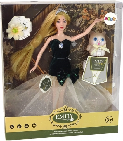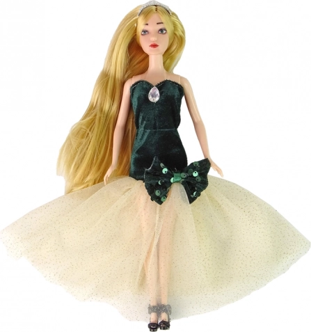 Bábika Emily nadchne svojím noblesným vzhľadom: horný diel šiat v tmavozelenom odtieni, bohato rozšírená tylová sukňa s leskom a detaily s flitrami dodávajú celej stylizácii výnimočný šarm. Čierne topánočky so zdobenou ružou dopĺňajú outfit, ktorý je ideálny na hranie aj do detskej zbierky.