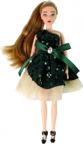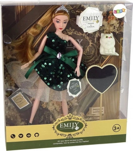 Vneste do detskej hry kúzlo s bábikou Emily – elegantnou bábikou s dlhými blond vlasmi, zlatou tiarou a šatami so zelenými flitrami. Pohyblivé končatiny umožňujú prirodzené pózovanie a jednoduché inscenovanie módnych prehliadok aj príbehov.