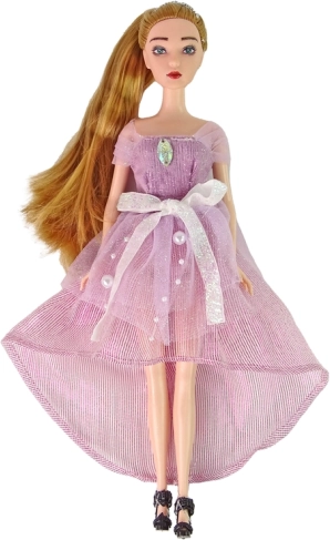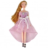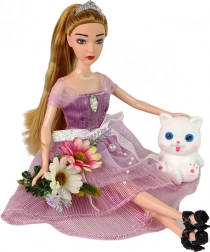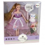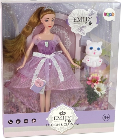 Vneste do hry vášho dieťaťa kúzlo s bábikou Emily. Má dlhé blond vlasy stiahnuté do copíka, nosí dlhé ružovo ladené šaty s korálikmi a mašľami, na hlave tiaru a na nohách elegantné topánky na opätku. Set dopĺňa biele mačiatko s modrými očami a dekoratívne kvety.