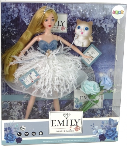 Očarujúca bábika EMILY v elegantných bielo-modrých šatách s trblietkami a pierkovým efektom poteší malé milovníčky módy. Set obsahuje rozkošné mačiatko a dekoratívne kvety. Bábika má dlhé blond vlasy s tiarou, výrazné modré oči a štýlové topánky. Skvelý darček podporujúci kreatívnu hru a rozprávanie príbehov.