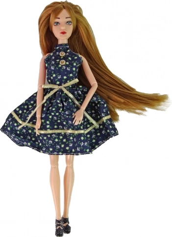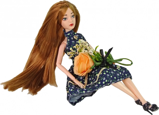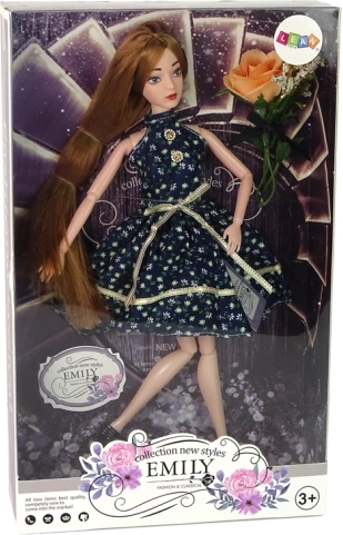 Štýlová bábika Emily s dlhými hnedočervenými vlasmi a modrými očami očarí malé milovníčky módy. Má kĺbové končatiny na realistické pózovanie, nosí tmavé šaty s kvetinovým vzorom a lodičky na opätku. Súčasťou je aj dekoratívna ruža. Ideálna veľkosť do detských rúk a skvelá ako darček.