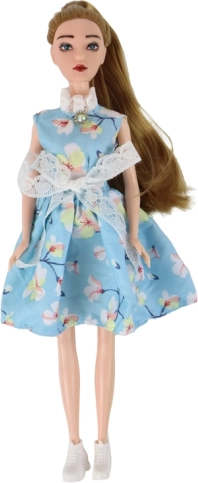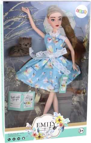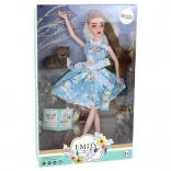 Bábika Emily (30 × 7 × 4 cm) je nežná spoločníčka pre tvorivú hru. Má dlhé vlasy v odtieňoch tmavej blond, ktoré možno ľahko česať a zdobiť, zelené oči a jemný make-up pre realistický vzhľad. Odená je do pôvabných modrých šiat s kvetinovým vzorom, čipkou, mašličkou a golierikom, ktoré dopĺňa drobný „diamantový“ detail pri krku a biele topánočky.