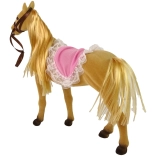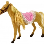 Hnedý kôň má nádherné ružové sedlo a dlhú hrivu, ktorú môžete česať priloženou kefou a hrebeňom.