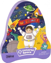 Obrázok zložený z puzzlí meria 50 cm x 34 cm a je plný živých farieb, ktoré vytvárajú veselú a energickú atmosféru. Puzzle pomáhajú rozvíjať manuálne zručnosti a koncentráciu detí, zatiaľ čo si užívajú objavovanie vesmíru.