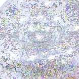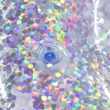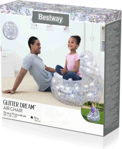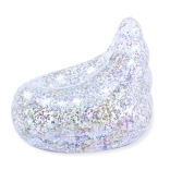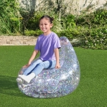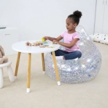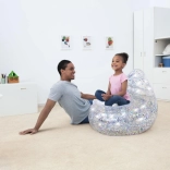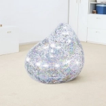 Nafukovacie kreslo sa pýši priehľadným plastom plným farebných trblietok, ktoré sa lesknú pri každom pohybe a dodávajú vášmu priestoru šmrnc.