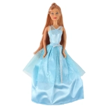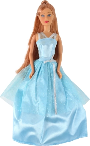 Bábika je oblečená v dlhých, trblietavých modrých šatách s tylovým prehozom a jemnými striebornými akcentmi. Ideálna pre kráľovské dobrodružstvá.
