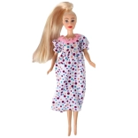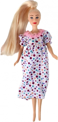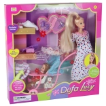 Bábika Lucy je krásne prepracovaná hračka s dlhými, lesklými blond vlasmi, ktoré sa dajú češať a upravovať. Jemne maľovaná tvár dodáva bábike realistický vzhľad, čo ešte umocňuje jej kúzlo. Je oblečená do bielych tehotenských šiat s farebnými bodkami.