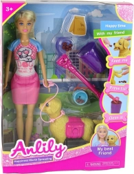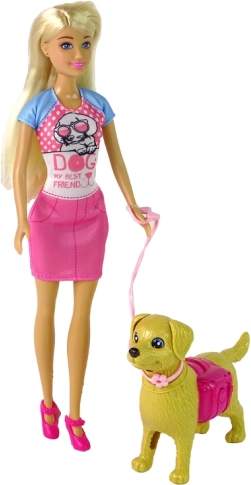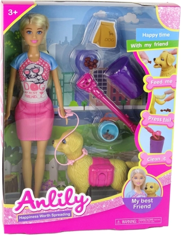 Roztomilá sada pre milovníkov zvieratiek: bábika so psíkom, ktorého môžeš nakŕmiť, vziať na prechádzku na vôdzke a naučiť sa starostlivosti a zodpovednosti. Bábika má pohyblivé končatiny, psík reaguje pohybom chvosta, uší a papule a súčasťou sú aj miska s granulkami, vôdzka, kôš a lopatka.