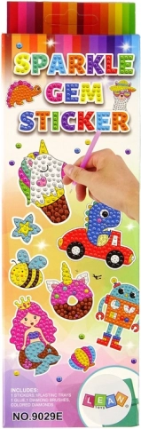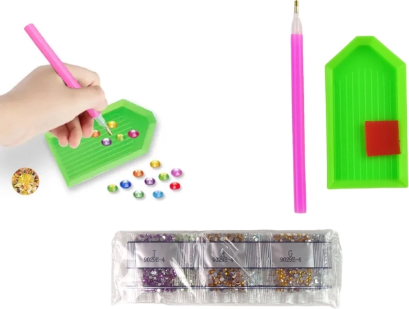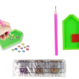 V sade nájdete rôzne farby kryštálov, ktoré použijete k dekorácii nálepiek. Povrch nálepiek je pokrytý lepiacou vrstvou, s číslovaním pre použitie farieb. Kryštál priložte jeden po druhom a vytvorte malé umelecké dielo.