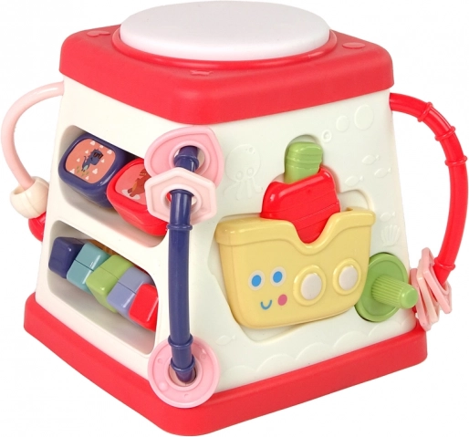 - Svetelné efekty, melódie, zvuky zvierat, anglické slovíčka, ozubené kolieska, koráliky, loďka na otočnej páčke, tvary na precvičovanie motoriky
