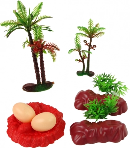 Doplnky tvoria dva kamene, dva kry, dva stromy a dve dinosauří vajcia s podstavcom, ktoré dotvárajú autentické scenáre a zvyšujú kreatívny potenciál hry. Táto sada je navyše vyrobená z trvácneho plastu, čo garantuje jej dlhú životnosť a odolnosť voči detským dobrodružstvám.