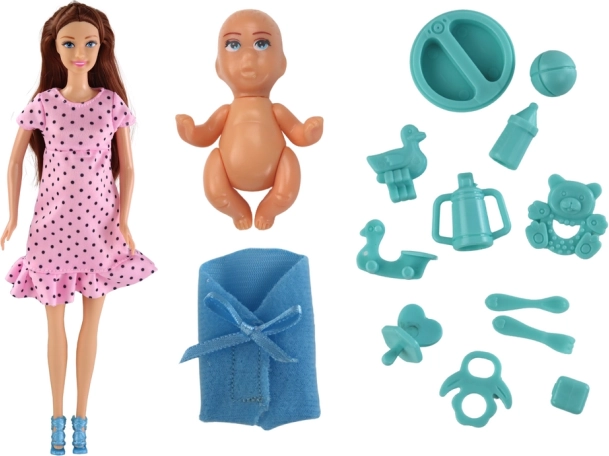 Súčasťou setu sú rôzne doplnky ako hračky, fľaštičky a podbradník pre hru a starostlivosť.