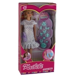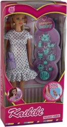 Bábika sa pýši elegantným vzhľadom v bielych šatách s čiernymi bodkami, ružových topánkach a módu dopĺňa malá kabelka.